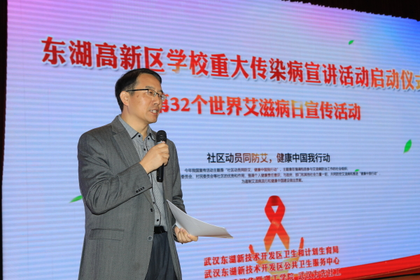 东湖高新区卫计局科长梁杰首先对支持校园宣讲活动的各位领导、老师、志愿者们表示了衷心的感谢。随后,他详细介绍了“东湖高新区学校重大传染病防治宣讲项目”的具体内容及实施举措,并希望老师和同学们能高度重视、增强防艾意识,加强宣传教育,普及艾滋病、结核病防御知识。