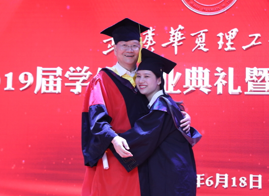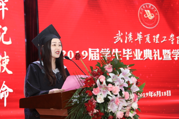 毕业生代表、商学院张紫荣同学与现场师生们分享了自己大学四年的收获和感悟。她说道,美好的年华只有一次,年轻时必须好好努力,并感慨 “华夏学子聚是一团火,散是满天星。”“待到功成名就时,衣锦荣归报故里……”言语中充满了对母校、老师、家长、学友的感恩和眷恋。