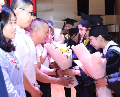 随后,毕业生代表为专职教师代表张丽、汪芳、张羽佳,辅导员代表鲁煜霖,实验员代表刘桂艳,职工代表黄建华,宿舍管理员代表张国华,后勤服务人员代表成志明等教职工献花致谢。