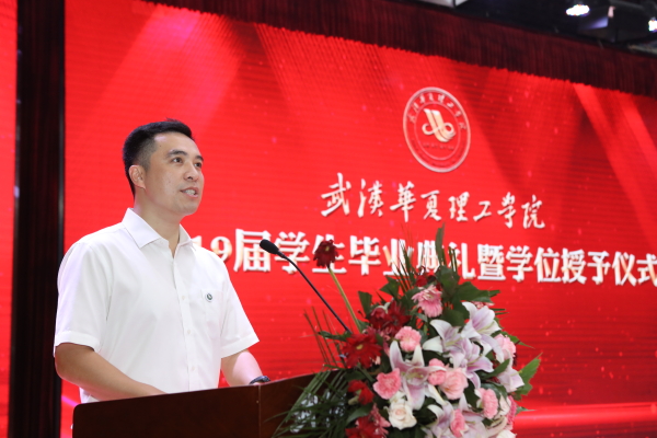 上午9时,毕业典礼在庄严的国歌声中正式拉开帷幕。执行校长郭彪致辞。他代表学校向顺利完成学业的毕业生表示热烈的祝贺,向老师们致以崇高的敬意,向始终支持学校发展的家长和社会各界朋友表示衷心的感谢。他回顾了2019届毕业生与学校共同成长进步的四年时光,指出他们不仅是母校发展的见证者和亲历者,更是母校发展的建设者和受益者。在这个隆重的“毕业礼”“启程礼”上,他对毕业生们提出四点希望,希望他们用一颗平常心来做人,立足当下,热情不退,动力不减,与善同行;希望毕业生们以一颗进取心来做事情,每天进步一点点,努力实现人生的目标;希望他们以一颗责任心来面对生活,时刻牢记责任,经得住诱惑,耐得住寂寞,顶得起压力,担得起重任;希望毕业生们努力发现生活中的美,继续健全人格、努力提高综合素质,成为有情怀、有温度的人。