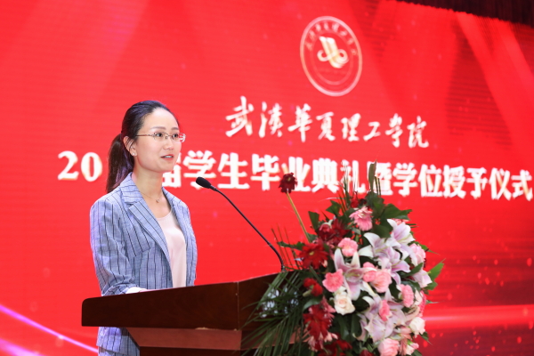 校友代表、商学院电子商务2009届毕业生、现任湖北三环成套工业有限公司市场部部长唐诗发言。她回忆了自己大学生活的难忘点滴,并鼓励毕业生们,进入工作岗位后用最快的时间适应工作,积累经验,增强实力。无论外界环境怎样变化,都要怀揣理想和信心上路。