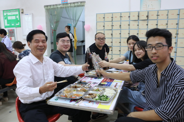 用餐过程中,校领导、各院系老师们亲切与毕业生交流,了解毕业生就业去向、工作薪酬等情况,互相分享大学时的趣事,师生如同好友般相谈甚欢,毫无拘束。学生们抓紧最后时刻以饮料代酒向老师表达谢意;还有不少学生排队和校长老师合影留念,气氛温馨感人。用餐毕业生里不少有家长陪同,一起拿着免费餐券共进午餐,其乐融融。