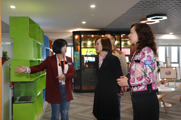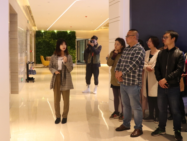 随后,我校师生代表们依次参观了当代教育集团的休闲区、办公区、会议室等,对公司的办公环境、文化品位、管理制度及人文关怀细节都赞叹不已。如企业文化活动墙上别出心裁地挂着由纸板自制拼成的地图,展示着公司的业务在全国的布局情况;由我校艺术学院学生制作的“一国两制”“一带一路”等字画一体的毕业设计作品也赫然展示在列;以古典书院的形式命名的会议室,如“长留”“云端”“白鹿原”等,都让活动参与者深深领略到了企业“善”“爱”“任”“毅”“诚”的价值观。