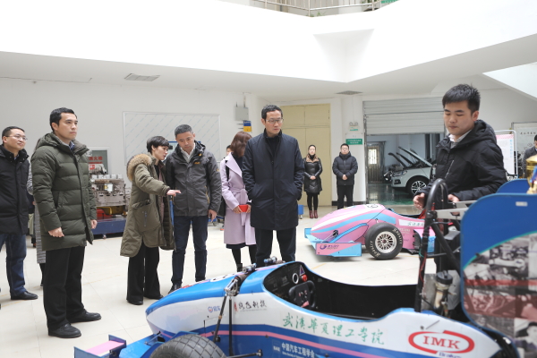在汽车工程学院实验楼,来宾一行饶有兴趣地听取了我校华耀追梦车队队长对车队整体情况的介绍,以及学生自主研发的两台赛车的结构、性能、DRS设计专利及参赛获奖情况,他们对我校学生的创新能力和团队精神给予了高度评价。