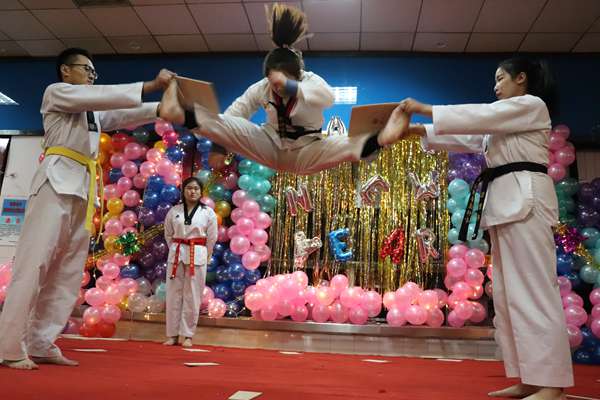 在二楼,以“环游世界”为主题的各学院展区特色鲜明,每个学院以不同国家为主题,展示世界多元的文化习俗,让人大开眼界。其中商学院展区以埃及为主题,现场扮演的埃及法老、木乃伊惟妙惟俏;汽车工程学院装扮的丹麦童话王国让人童心爆棚。现场还有不少互动小游戏让师生们欢乐开怀:外国语学院组织的吹乒乓球游戏,给现场气氛添加了些紧张和刺激;土木建筑工程学院的“抢凳子”游戏让师生再次体验了一把儿时的欢乐……闪闪发光的装饰、五颜六色的气球、色彩斑斓的彩灯和师生们脸上开心的笑容交织在一起,现场处处弥漫着祝福声、喝彩声和掌声,一片喜庆祥和、热闹欢快的氛围。
