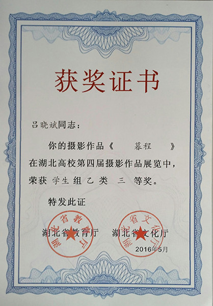 艺术设计与传媒学院侯国栋老师指导、车辆1125班吕晓斌创作的《暮程》获得学生(非专业组)三等奖;设计与传媒学院方晓路的《海殇》获得教师(专业组)三等奖;侯国栋的《画布》获得教师(专业组)优秀奖,这是我校在摄影类赛事中的一次突破,也是我校摄影通识教育取得的成果。