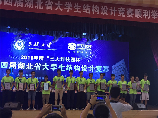 7月14日至7月18日,“三峡杯”第四届湖北省大学生结构设计竞赛在三峡大学举行。来自武汉大学、华中科技大学、武汉理工大学、湖北工业大学在内的23所高校、66支队伍参加了比赛。我校土木建筑工程学院派出三支队伍参加,经过激烈角逐,最终取得了二等奖两项、三等奖一项的好成绩。