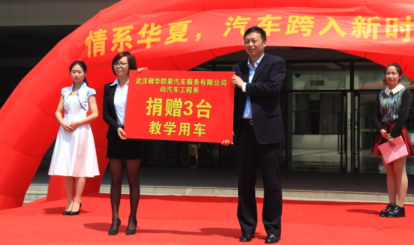 今年的汽车文化节中,武汉精华群豪汽车服务有限公司为我院汽车系提供了三辆教学用车以供学生的实践学习,增强了我院汽车系的硬件设施。汽车工程系党总支书记刘源与武汉精华群豪汽车服务有限公司蔡经理交接转赠牌,完成了捐车仪式。