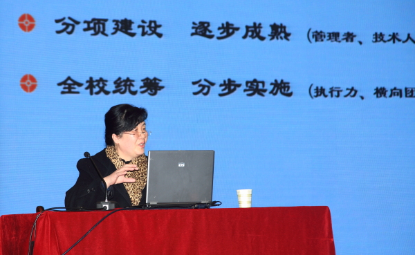 随后,她以武昌首义学院信息化管理的具体概况和模式为例,详细说明高校应该如何突破发展瓶颈。她表示,学院应当注重基础设施建设、应用系统建设、教育资源建设、保障体系建设、图书馆管理建设以及后勤管理建设等。她强调,现代教育信息化是个一体化过程,每个步骤都要同步进行。在讲座过程中,她深入浅出地将专业术语通俗化,并恰到好处地列举案例,受到教职工的广泛欢迎。