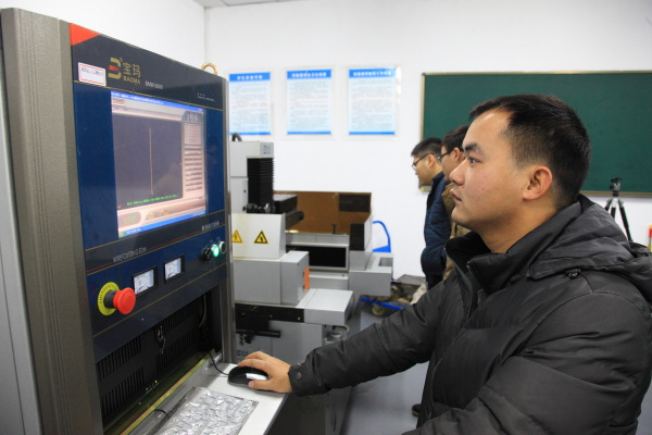 在实验中心特种加工技术实训室,实验中心副主任汤剑老师介绍到,特种加工技术实训室和金工实训部承担了成型、机自、机电、车辆等多个专业的金工实训环节,老师利用新引进的仪器设备电火花线切割机床进行教学,直接使用Auto-CAD软件,去掉3B编程,优化了教学模式,使实验、实训的教学效果更加显著。