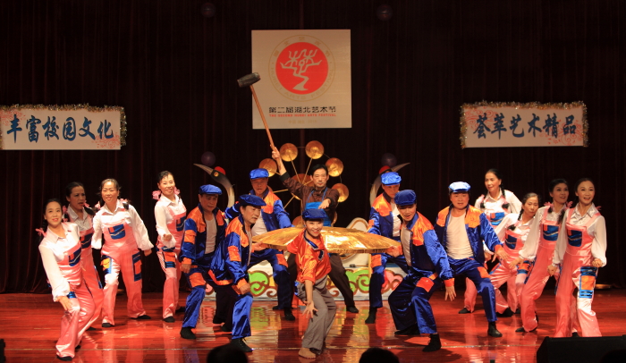 由洪山区文化馆演出的《高洪太-中国锣》拉开演出序幕,老艺术家们用饱满的热情和精湛的武艺赢得现场阵阵喝彩;2006年全国青年歌手大奖赛原生态组金奖获得者王爱民、吴娟身着民族服装,深情演绎歌曲《花咚咚的姐一朵花》;《宝贝回家》寄托了人们对走失孩子重回母亲怀抱的美好愿望;湖北26岁消防员皇甫江武抱喷火煤气罐出火场的故事,由湖北省群众馆和襄阳市群众艺术馆合作,通过湖北大鼓《最美抱火哥》通俗生动搬上了舞台;13岁最小演员郑博杰来自潜江,他给现场观众讲述了一段抗日小英雄的故事《海娃送信》,赢得观众阵阵掌声。整场文艺演出形式丰富多彩,涵盖舞蹈、歌曲、器乐合奏等节目,文艺水平较高,集中展示我省了近年来创作演出的优秀剧目。