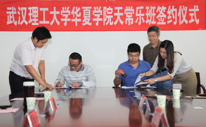 2015年10月23日,我院与武汉天常乐科技有限公司校企合作协议签约仪式在综合楼会议室举行。武汉天常乐科技有限公司董事长刘振,学院副书记、副院长李海民,土木系主任杨和礼、土木系党总支书记陈伟出席签约仪式。签约仪式后,武汉理工大学华夏学院天常乐班开班宣讲会在学术报告厅举行。