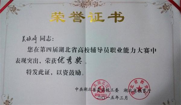 近日,为期三天的湖北省第四届辅导员职业能力大赛在华中师范大学举行,我院化学与制药工程系辅导员吴振琦在比赛中获优秀奖。
