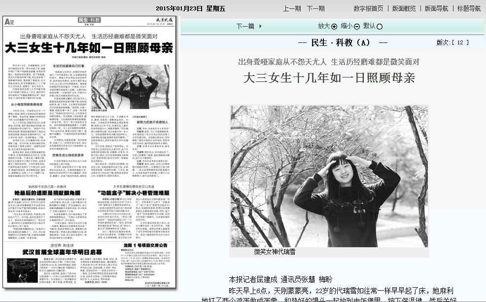 1月20日,我校2014年度人物评选结果揭晓。自强不息、学艺双馨的“最美微笑女神” 代瑞雪和笔耕不缀、才华横溢的“追梦作家”杨焌逸名列榜单。1月23日,武汉晚报科教版头条以《出身聋哑家庭从不怨天尤人,生活历经磨难都是微笑面对----大三女生十几年如一日照顾母亲》为题,对代瑞雪进做了近3000字的人物通讯报道。报道一出即引起社会广泛关注。随后,楚天金报跟踪拍摄了代瑞雪一天的生活,1月24日,楚天金报整版图文报道《微笑女孩逆风飞翔: 女大学生代瑞雪的一天》,并在当天报纸头版做导读链接。当天,湖北日报也以《生活,请让我在你面前微笑》为题,报道了“微笑女神”代瑞雪身特殊家庭仍乐观顽强面对生活的感人事迹。随后,新华网、人民网、新浪、网易、中国网、荆楚网、长江网等多家门户网站纷纷转载,转载次数近百次,网上反响强烈,不少网友表示被代瑞雪的故事感动落泪,认为她身上蕴含的正能量是90后学习的榜样。