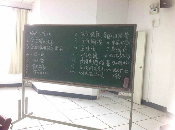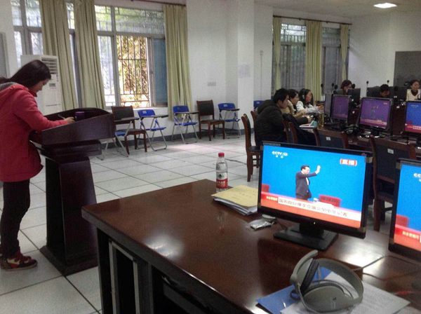 口译教师在黑板上写下了几十个热点词汇,包括“一带一路”、“简政放权”等,引得同学们分组竞相抢译,通过一轮轮比拼,最终由第一组同学拔得头筹。热点词汇热身之后,便是真枪实战的口译任务啦。老师将3月15日的国务院总理答记者问搬进了课堂,现场指定学生为总理做口译。同学们都积极表现,认真记好笔记符号,并尽最大努力忠实、流畅、准确地传达总理的意思。做完后同学们表示,尽管自己和电视里的口译专家还有很大一段距离,但能体验一回给总理做口译的感觉还是很棒的。看到了差距,就知道了自己今后要努力的方向。