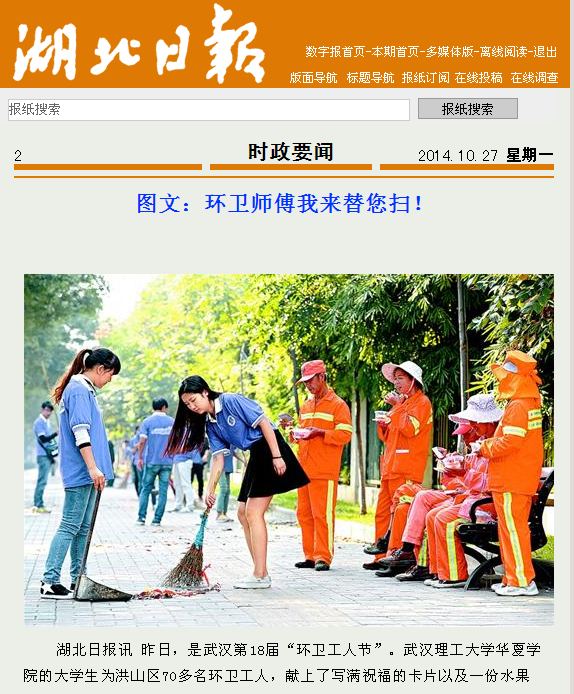 10月26日是我国环卫工人日,湖北日报报道了我院刘普林志愿服务队开展的“今天您休息,环卫我当家”活动,此活动受到了广泛关注和好评,凤凰网、网易新闻、新浪网和搜狐网等多家主流媒体纷纷转载。