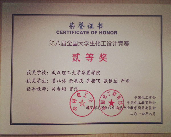 来自化学与制药工程系的夏江林等五位同学在第八届全国大学生化工设计竞赛“中国石化——三井化学杯”中荣获二等奖。