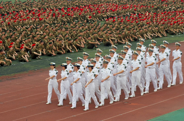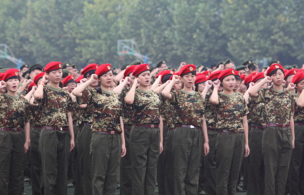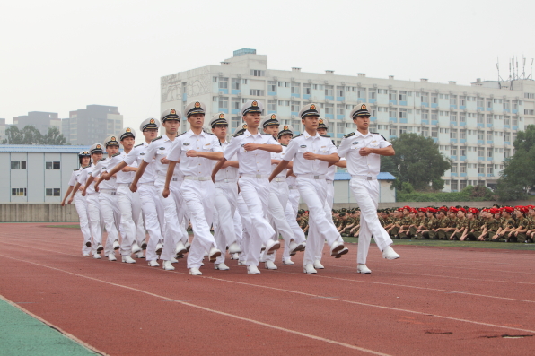 2014级全体军训学员在老师的带领下进行庄严而激昂的宣誓。海军工程大学承训部队进行精彩的队列表演,赢来全院师生热烈的掌声。会后,我院2014级新生正式开始了为期半个月的军训生活。(文/李 甜 图/张培杰 徐 康)