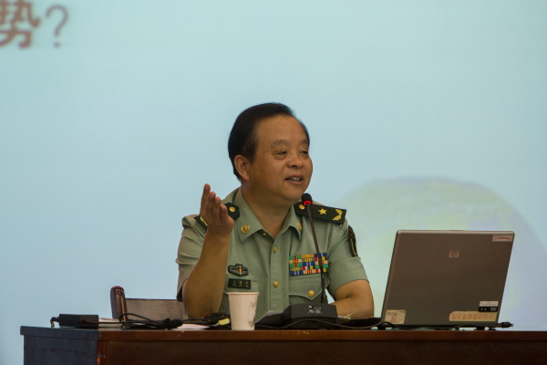 报告会邀请到了军队院校育才奖“金奖”获得者、湖北省国防教育讲师团成员、第二炮兵指挥学院王连平少将为师生作报告。王连平将军通过列举各种实例,详细分析了中国周边环境的国防现状,着重从美国全球战略、中美博弈的特点规律及全球视角科学战略运筹三个方面阐述如何观察、判研、解决中国周边问题。