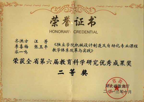 2013年,省教育厅组织开展了全省第六届教育科学研究优秀成果评选奖励工作,我院《独立学院机械设计制造及其自动化专业课程体系改革与实践》获 “湖北省第六届教育科学研究优秀成果”二等奖。