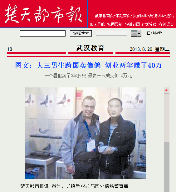 吴锦阜是我院化学与制药工程系的大四学生,他进入信鸽行业只有短短两年多的时间,通过从国外引进知名的赛鸽品种到国内贩卖,目前已经赚了约40万元。在大学生创业比比皆是的今天,能像吴锦阜这样迅速获得成功的例子却屈指可数。在谈及创业成功的因素时他说,创业最先要考虑的还是市场需要,因此个人对市场的洞察能力就显得极为重要。贩卖信鸽作为一种新兴产业,市场需求旺盛,在各类行业中显得新颖,便能走在市场的前沿。