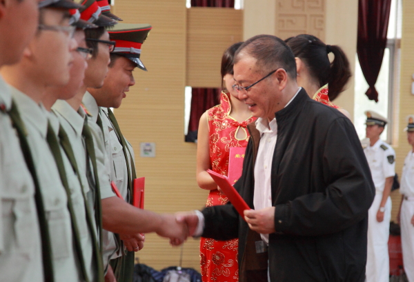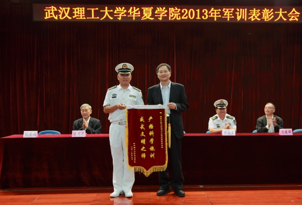 院长吴永桥为承训部队赠送锦旗,由海军工程大学动力学院学员三旅副旅长、我院军训团团长姚雪华上校接旗。 (文/李甜 图/张培杰)