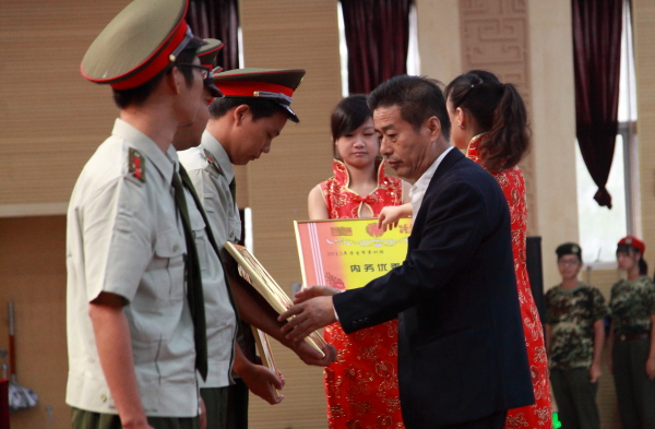 大会在雄壮的国歌声中拉开帷幕。学院助理、学生工作处处长李海民宣读了《关于表彰2013级新生军训工作先进集体和先进个人的决定》,分别授予六营十一连、一营一连、一营二连、三营六连、五营九连“宣传报道先进连队”称号,四营八连、五营十连、二营三连、七营十二连、四营七连“内务卫生优秀连队”称号,授予陈德礼等8名老师“优秀指导员”称号,左任远等10名教官“优秀教官”称号。