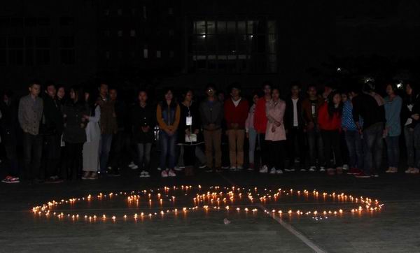 4月21晚8点我院学生在一食堂对面篮球场上举办了以“同舟共济 守望相助 华夏学子心系雅安”为主题的活动。