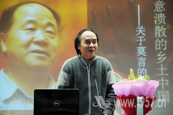 讲座开始,王又平教授引用瑞典文学院院士、诺贝尔文学奖评委会主席佩尔·韦斯特伯格的颁奖词,并结合莫言获诺贝尔文学奖的6个幸运号,见仁见智地评说莫言。他大胆猜测莫言出席领奖活动的着装,并通过观看著名导演张艺谋的电影《红高粱》初探莫言的小说世界。