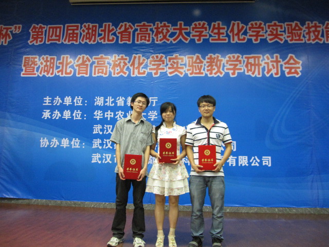由湖北省教育厅主办的第四届湖北省普通高校大学生化学实验技能竞赛暑假期间举行,我院化学与制药工程系吴迪同学通过扎实的理论基础、过硬的实践实验操作技能和良好的心理素质,战胜了众多名校学子,荣获一等奖,其余2名同学分别获得二、三等奖。