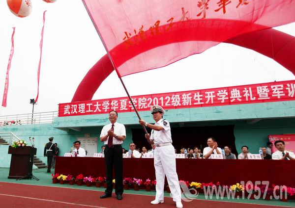 武汉理工大学副校长、我院党委书记严新平为军训团授旗,军训训练团团长唐贤仿上校接旗。