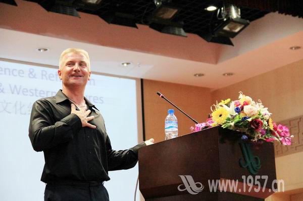 “我往返于中英两国已经12年了,我很喜欢中国。”来自英国的James先生言语中表露了对中国传统文化的热爱。随后,他以“我是谁?”、“我对文化差异的看法”、“新产品的开发”等问题开篇,从中西企业的运营思路、管理方式、合作形式以及企业管理者等方面对中西文化差异进行了阐述。James先生与翻译刘丽还现场演示了中西方人民的问候方式,生动形象的演示博得大家的阵阵掌声。