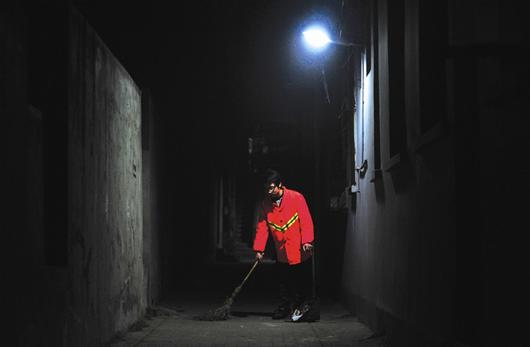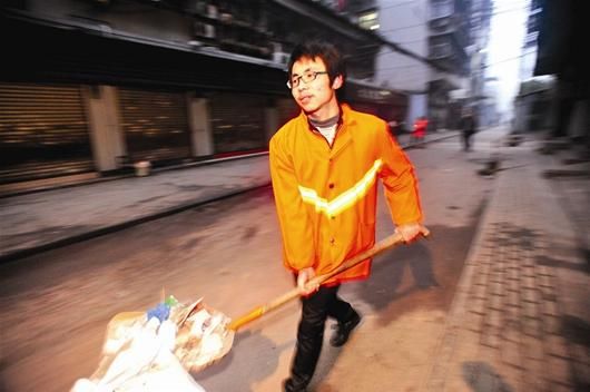凌晨5点半,当整个城市还在熟睡之中时,哗、哗、哗的扫地声不紧不慢地回荡在凌晨清冷的武汉市涵三宫街上了。