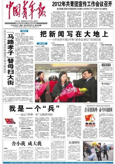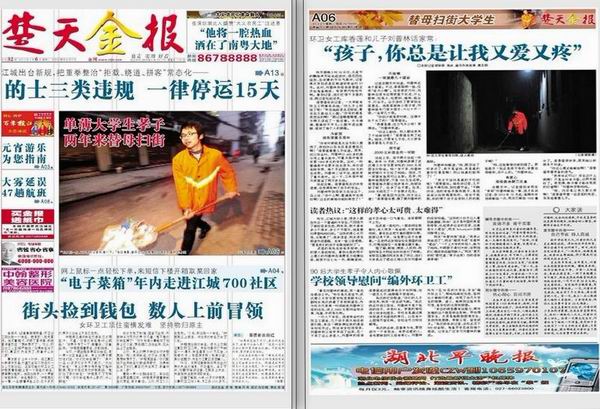 近日,随着中央和我省媒体的相继报道,武汉理工大学华夏学院经济与管理系学生刘普林两年来替母扫街的感人事迹, 赢得了全社会的广泛赞誉。2月10日,《中国青年报》于头版刊发新闻“马路孝子替母扫大街”,颂扬他感恩父母、勇担责任的当代大学生精神。