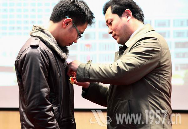 武汉理工大学团委书记孟芳兵为刘普林授予武汉理工大学“青年五四奖章”。