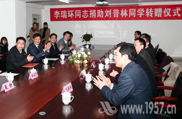 2月22日下午3点,王沪宁同志捐助刘普林同学转赠仪式在武汉理工大学华夏学院会议室隆重举行。湖北省委高校工委书记、省教育厅党组书记蔡民族同志、团省委副书记胡勇政同志、省教育厅思政处处长杜海鹰同志、省教育厅办公室刘维国同志、思政处雷松同志、资助中心程学奎同志、团省委学校部部长吴红斌同志、光明日报驻湖北记者站站长夏静同志出席仪式,武汉理工大学副校长、武汉理工大学华夏学院党委书记严新平同志、武汉理工大学学工部部长赵海信同志、宣传部副部长沈革武同志、 团委书记孟芳兵同志、武汉理工大学华夏学院董事长张晓东、院长吴永桥、常务副书记张荣国参加。转赠仪式由学院党委副书记、副院长吴汉桥主持。
