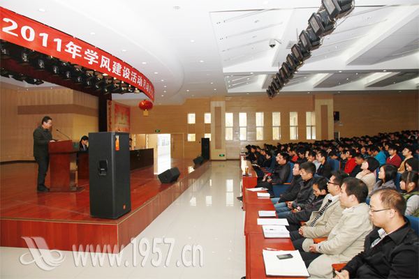 学工处处长李海民宣读了《关于开展2011年学风建设月活动的通知》,并介绍本次学风建设活动月将从本月18号持续到下月18号,分动员准备阶段、具体实施阶段和总结阶段,主要是针对学生的生活、学习及习惯进行一系列的建设活动。