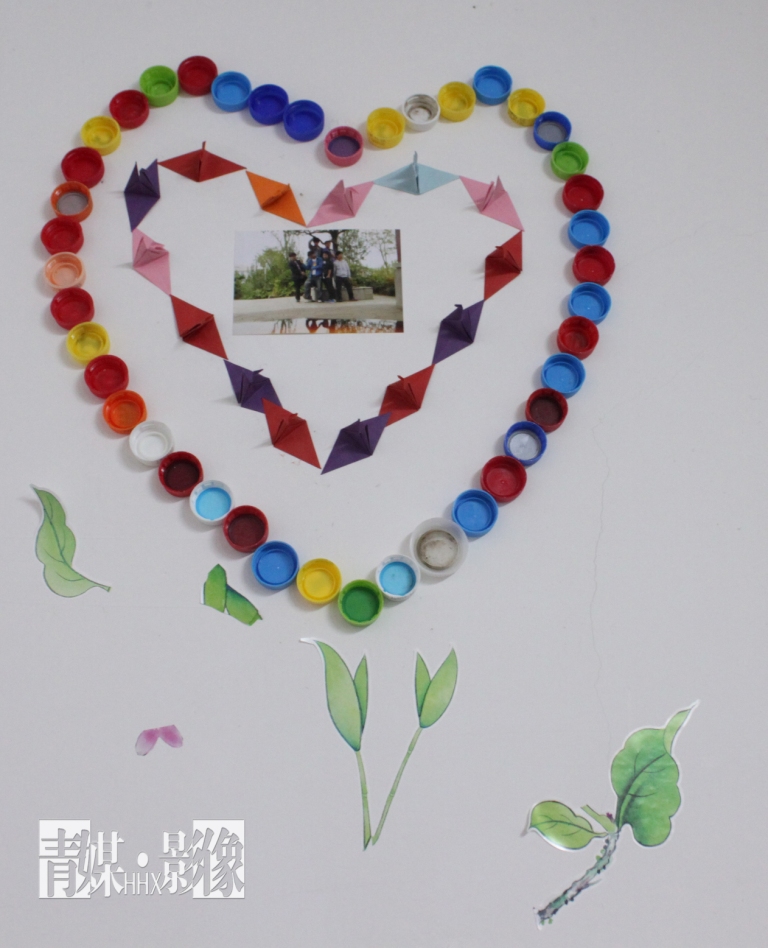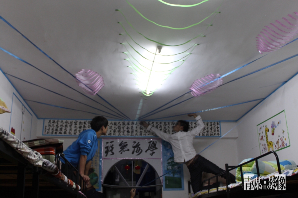 7B—532寝室提倡绿色环保,将收集到的柳条做成一个花篮挂在室顶,将花瓣一片片地贴在窗户上,将用手叠成的小星星一个个粘在树叶上,然后挂在门前,体现了女生特有的细心。