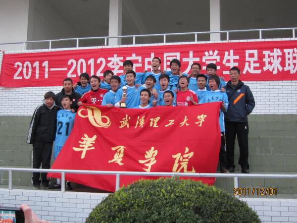 12月1日下午,由湖北省大学生体育协会主办,湖北大学、湖北省大学生体育协会足球分会承办的2011—2012“李宁杯”中国大学生足球联赛湖北赛区丙组决赛在湖北大学拉开战幕,我院足球队在体育课部刘涛、许敏、姬世界老师的带领下参加了决赛,经过顽强拼搏,获得亚军。