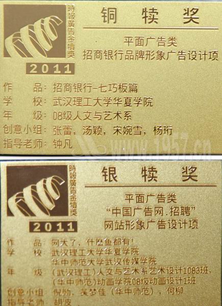 6月15日晚,全球最具影响力的华人学生广告创意大赛——时报金犊奖颁奖盛典在北京大学百周年纪念讲堂隆重举行。当晚共颁发奖项十余组,我院人文与艺术系学生倪勋、何柳等的广告设计作品《网大了,什么鱼都有!》喜获平面类大学组银犊奖;张蕾、汤颖等设计的《招商银行—七巧板篇》获平面类大学组铜犊奖。