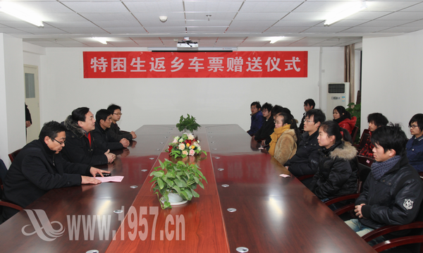 1月18日下午,窗外雪花飞舞、寒风袭人,我院综合楼0403会议室内却是暖意融融,这里正在举行特困生返乡车票赠送仪式。