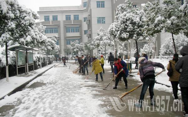 为了确保师生雪天能够正常工作和学习,行政处要求后勤服务中心加强雪天防寒防冻工作,后勤服务中心随即对相关工作进行了安排。为防止师生滑倒,后勤服务中心组织相关人员在食堂、学生公寓入口处铺设了防滑地毯,并组织80余保洁员工从早上6时起,清扫综合楼、教学楼、实验大楼、食堂及学生公寓等主要干道的积雪,早上8时左右,全院主要道路基本上安全畅通,师生出行便利。后勤水电维修班也安排相关人员24小时值班,随时对校园的水电设备进行检修和维护。