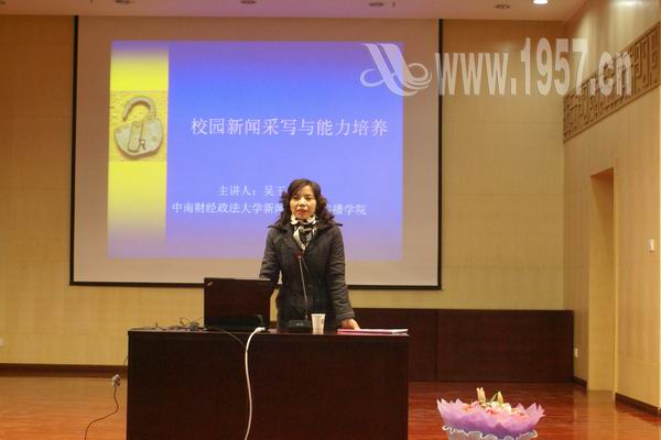 16日,中南财经政法大学新闻与文化传播学院副院长吴玉兰教授做客华夏讲坛,讲述校园新闻写作的基本理论知识,以帮助大家认识媒介,提高媒介素养。