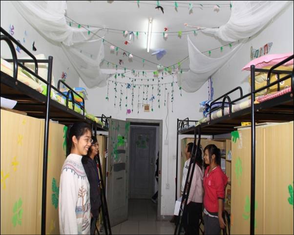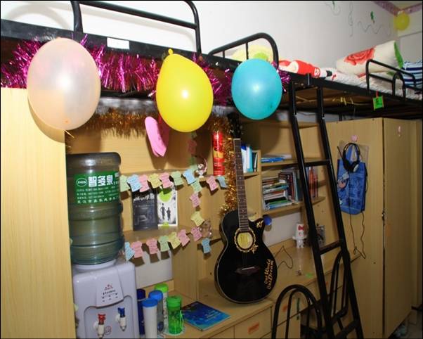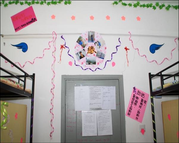 这间寝室大门上用彩带编织出大大的“缘”字,走进寝室看见每张床的墙壁上都有贴着个人的生活照片以及各自所喜欢的句子,而在门的背面布置有一个精致的“缘”字,围绕“缘”字的就是寝室各成员的照片。寝室的杨光同学介绍说:“就像照片反映的一样,我们每个人都有这自己的爱好和生活,由于“缘”字的拉扯,我们走到了一起,我们会珍惜这份难得的缘分。”