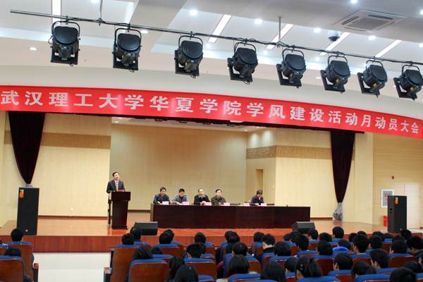 武汉理工大学华夏学院学风建设月动员大会于11月24日16:00在学术报告厅召开。学院副院长常恩霖、党委副书记、副院长吴汉桥、党群工作部部长许新华、教务处处长丁成忠、学工处副处长靳路民、团委书记淡玉堂等参加了此次会议。