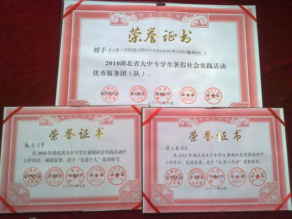近日,省委宣传部、省文明办、省教育厅、团省委、省学联等部门联合对2010年大中专学生暑期社会实践活动进行表彰。我院《华夏风》杂志社赴仙桃张沟镇农业产业调整及优化典型社会实践队被授予“湖北省大中专院校暑期社会实践优秀团队”,赴黄冈英山陶家河乡小学捐建爱心图书室及爱心走访实践队的鲍泉同学被评为“湖北省大中专院校暑期社会实践先进个人”,团委书记淡玉堂被评为“社会实践先进工作者”。