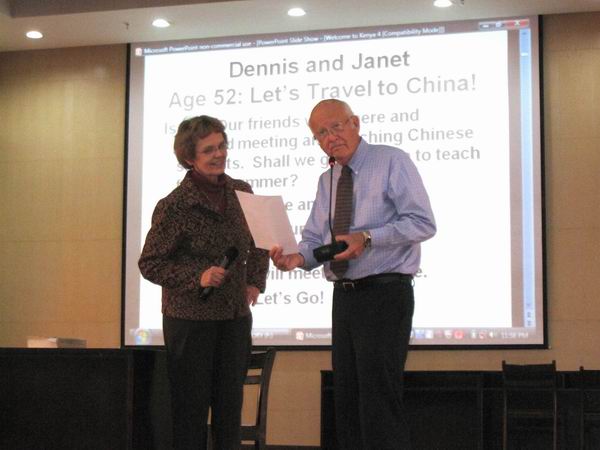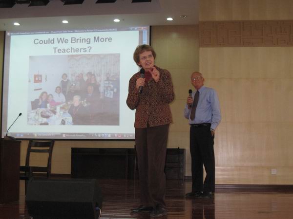 讲座第一个环节外教Dennis Hagen和Janet Hagen采用对话的方式介绍了自己的家庭,Janet Hagen风趣幽默地讲述了自己是四个孩子的母亲和十一个孩子的外祖母。在个人经历中,Dennis Hagen和 Janet Hagen特别讲述了他们在国外帮助创建学校的经历。