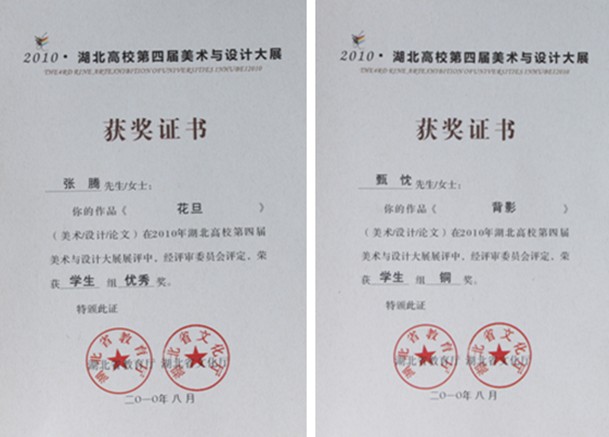 湖北高校第四届美术与设计大展历时半年,经初评、终评两轮评选,其结果于近日揭晓。我院人文与艺术系师生共获6项奖项,其中学生1件作品获美术类铜奖、1件作品获优秀奖、2件作品入选,教师1篇论文获三等奖、1件设计作品获入选奖。