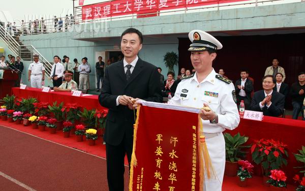 “汗水浇华夏,军姿育桃李”, 张晓东董事长向海军工程大学赠送锦旗。