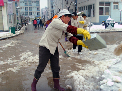 中午后勤员工放弃了午间休息的时间,争分夺秒,主动参加打扫,下午2:00,在大家的共同努力下,校园的干道积雪已基本被清除干净,后勤员工用他们的辛勤劳动消除了安全隐患,换来了全院师生出行的方便和安全!